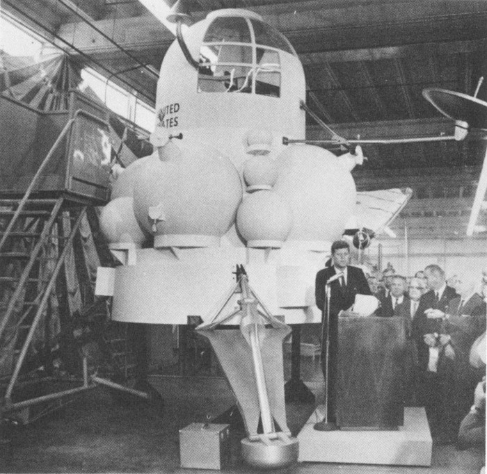 President John F. Kennedy standing beside a full-scale model of the Apollo lunar landing vehicle, which was shown for the first time during the President’s inspection of the Manned Spacecraft Center in September, 1962.