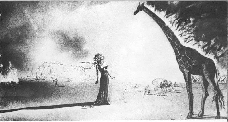 Salvador Dali’s surrealistic impression of Houston was a result of his visit to the city in 1952. The flaming giraffes symbolize oil derricks, at which a woman, her face covered with camellias, looks with eager expectation. The port and the pioneers are shown in other symbols.