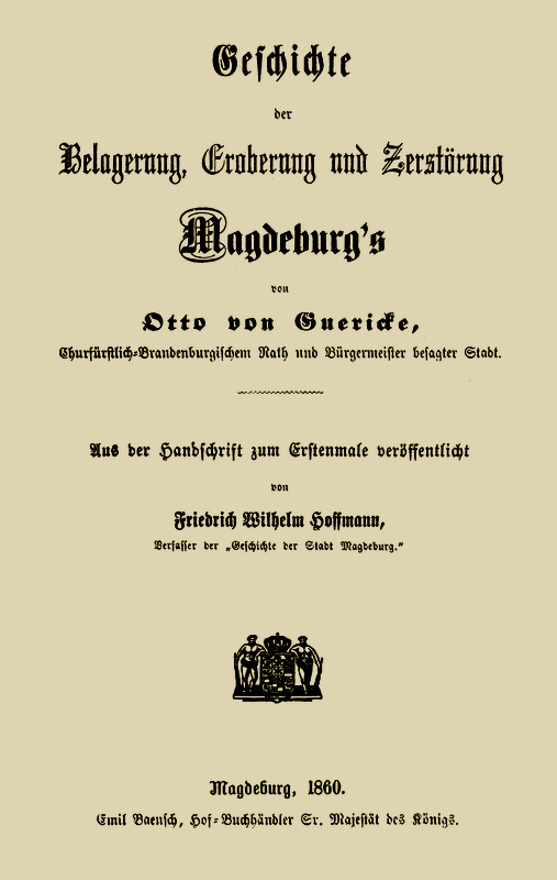 Dem Leser am Schlusse dieser Vorbemerkung noch ein Wort zur Empfehlung des kleinen Buches, welches ich hiermit in seine Hände lege, sagen zu wollen, halte ich für durchaus überflüssig. Guericke war Augenzeuge der Ereignisse, welche er schildert; er war vermöge seiner amtlichen Stellung, als Rathmann und Bauherr der Stadt, sehr genau davon unterrichtet und überdies ein Mann von so anerkannter Ehrenhaftigkeit, daß wohl nicht im entferntesten von irgend einer absichtlichen Entstellung der Wahrheit in seiner Erzählung die Rede sein kann.