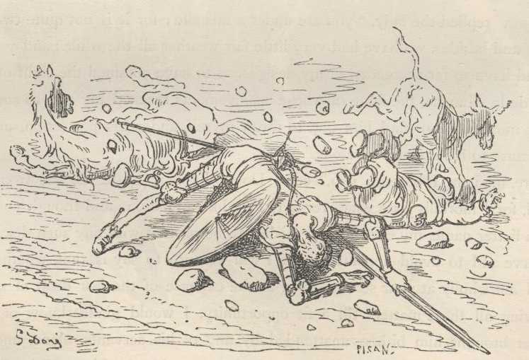 The book cover and spine above and the images which follow were not part of the original Ormsby translation—they are taken from the 1880 edition of J. W. Clark, illustrated by Gustave Dore. Clark in his edition states that, "The English text of 'Don Quixote' adopted in this edition is that of Jarvis, with occasional corrections from Motteaux." See in the introduction below John Ormsby's critique of both the Jarvis and Motteaux translations. It has been elected in the present Project Gutenberg edition to attach the famous engravings of Gustave Dore to the Ormsby translation instead of the Jarvis/Motteaux. The detail of many of the Dore engravings can be fully appreciated only by utilizing the "Enlarge" button to expand them to their original dimensions. Ormsby in his Preface has criticized the fanciful nature of Dore's illustrations; others feel these woodcuts and steel engravings well match Quixote's dreams. D.W.