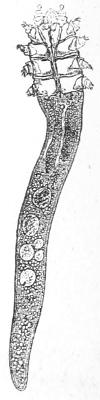 Lernæocera again, which in the adult condition is found attached to the gills of fishes, has lost the well-developed legs of its Nauplius childhood and become an elongated worm-like creature (Fig. 8), fitted only to suck in nourishment and carry eggs.