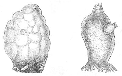 Fig. 13.—Two adult Ascidians: to the left Phallusia—to the right Cynthia: the incurrent and excurrent orifices are seen as two prominences. Half the natural size.