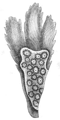 Fig. 14.—A colony of compound Ascidians (Botryllus) growing on a piece of sea-weed (Fucus). Each star corresponds to eight or more conjoined Ascidians. Natural size.