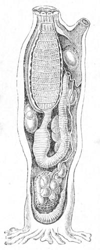 We will examine one of the simple forms—a tough mass like a leather bottle with two openings; water is continually passing in at the one and out at[40] the other of these apertures. If we remove the leathery outer-case (Fig. 15), we find that there is a soft creature within which has the following parts:—Leading from the mouth a great throat, followed by an intestine. The throat is perforated by innumerable slits, through which the water passes into a chamber—the cloaca: in passing, the water aërates the blood which circulates in the framework of the slits. The intestine takes a sharp bend, which causes it to open also into the cloaca. Between the orifice of the mouth and of the cloaca there is a nerve-ganglion.