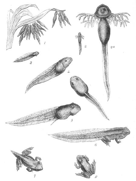Fig. 2.—Tadpoles and young of the Common Frog. 1, Recently hatched (twice natural size); 2 and 2a, same enlarged to show the external gills; 3 and 4, later stages with gill slits covered by a membrane leaving only the spiracle (see Fig. 16) as an exit for the respired water; 5, with hind legs appearing; 6, with both fore and hind legs; 7, atrophy of the tail; 8, young frog.