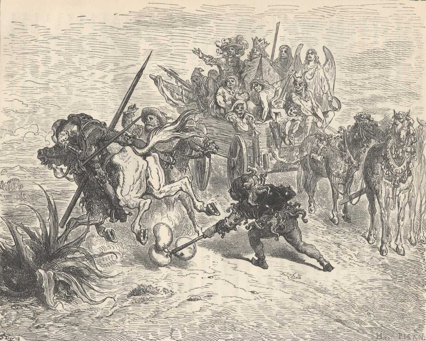 Don Quixote was about to reply to Sancho Panza, but he was prevented by a cart crossing the road full of the most diverse and strange personages and figures that could be imagined. He who led the mules and acted as carter was a hideous demon; the cart was open to the sky, without a tilt or cane roof, and the first figure that presented itself to Don Quixote's eyes was that of Death itself with a human face; next to it was an angel with large painted wings, and at one side an emperor, with a crown, to all appearance of gold, on his head. At the feet of Death was the god called Cupid, without his bandage, but with his bow, quiver, and arrows; there was also a knight in full armour, except that he had no morion or helmet, but only a hat decked with plumes of divers colours; and along with these there were others with a variety of costumes and faces. All this, unexpectedly encountered, took Don Quixote somewhat aback, and struck terror into the heart of Sancho; but the next instant Don Quixote was glad of it, believing that some new perilous adventure was presenting itself to him, and under this impression, and with a spirit prepared to face any danger, he planted himself in front of the cart, and in a loud and menacing tone, exclaimed, "Carter, or coachman, or devil, or whatever thou art, tell me at once who thou art, whither thou art going, and who these folk are thou carriest in thy wagon, which looks more like Charon's boat than an ordinary cart."