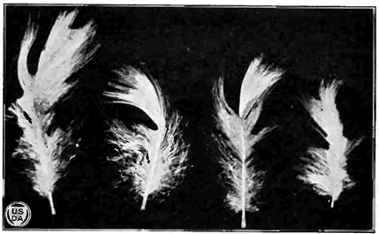 Fig. 3.—Feathers damaged by fabric pests. Injury has been done here by clothes moths and carpet beetles. They reduce feathers to a mat-like mass.