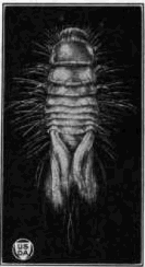 Fig. 5.—Black carpet beetle: Larval skin showing the typical shape of the larva and the long tuft of bristles at the end of the body. Greatly enlarged.