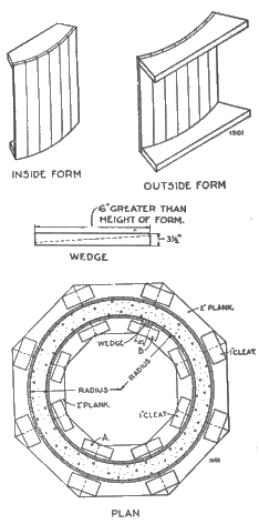 Example 3.[1]—A tank 9 feet inside diameter has walls 6 inches thick and 4 feet high (above the floor). The floor is 6 inches thick, the concrete is to be 1:2:4.