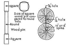 The logs should be pinned together with a wooden pin or large spike (fig. 11). Spiking is done by boring a ¾-inch hole halfway through the upper log and continuing with a 7⁄16-inch hole through the bottom half. Then drive a 10- or 12-inch spike into place, or until it penetrates half the next log below. The spikes should be « 13 » staggered in alternate rounds or tiers of logs. If wooden pins are used, fir or oak logs are preferable. Neither wooden pins nor spikes, however, offer interference to the settling of the walls.