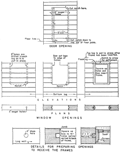 Door and window jambs should be framed just like the corners except that only the back should be grooved. The door side, or face, may be rabbeted or left smooth so that a separate wood door stop may be nailed in place. If the logs are reasonably dry, from 3 to 4 inches should be left at each corner for settlement due to shrinkage; otherwise, more or less space should be allowed, as conditions require. In about 6 months the cap log will come down and close this gap. Similar provisions should be made for settlement over door and window openings.