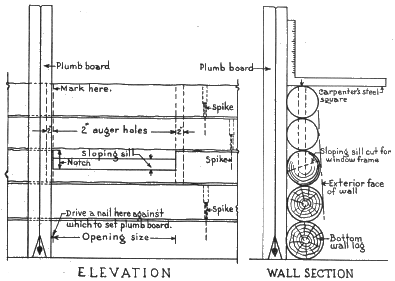 To provide the necessary doors and windows, openings must be cut in the walls after the logs have been placed in position. As soon as a log in the wall is cut in two, the problem arises of how to hold the loose ends in place. Also, the doors and windows require the proper kind of frames to insure airtight closure between the latter and the ends of the wall logs. The most practicable and satisfactory method is to frame a vertical notch in the ends of « 16 » the wall logs, into which can be fitted a spline attached to the back of the jamb or side-pieces of the door and window frames. This method of framing holds the wall logs in place, allows them to shrink and settle without hindrance, and makes a weathertight joint between them and the door and window frames. The vertical notch in the end of the wall logs may be framed by boring a 2-inch auger hole in each log as it is laid in place. The hole should be located so that, when the wall logs are sawed out for the opening, the saw cut passes down through the edge of the hole nearest the opening. It is then a simple matter to frame the notch to take the spline. The inside face of the notch can be left rounded and the spline chamfered to fit. To keep the holes in line from log to log, use the plumb board illustrated in figure 14.