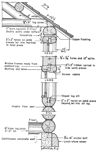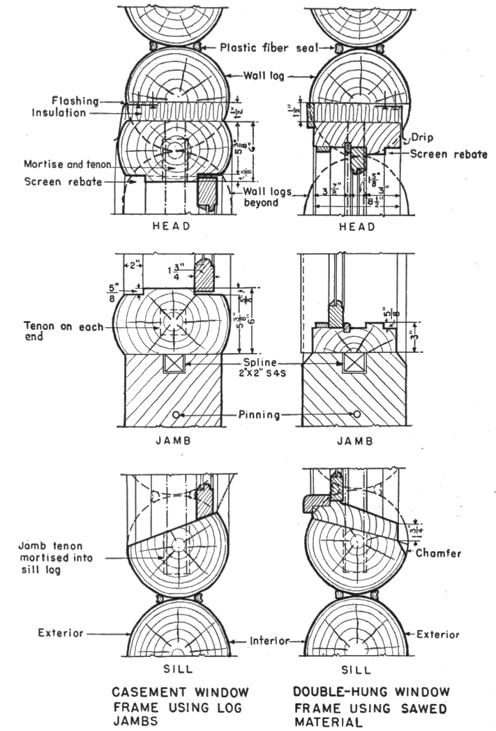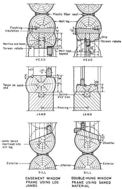Hanging doors and windows, and many other customary details of building construction should be done in the usual manner in building with logs. Whenever cupboards or other built-in units are constructed, they must be framed to be independent or entirely free of the log walls, like the furniture. However, such fixtures as lavatories may be attached to two adjacent logs without any subsequent structural complications.