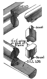 There are two ways of making window and door frames—in three pieces (two side jambs and one head jamb), or in four pieces (two side jambs, one head jamb, and a sill piece). When a three-piece frame is used, the bottom log of the opening is cut or shaped to make the window or doorsill and the jamb pieces are then fitted to the sill. If the jambs are framed from pieces of log slabbed on two opposite sides, a presentable frame in keeping with the log character of the structure is obtained. The window or door face of the jamb pieces may be rabbeted for the windows and doors, respectively, or they may have separate wooden pieces, known as stops, nailed on. The spline on the back of the jamb may be rabbeted out, or a 2 inch by 2 inch piece of straight-grained wood nailed on. The head jamb can be framed in the same way; it does not require a spline on the back. Each side jamb has a dowel framed on each end. The bottom dowel fits into a mortise in the sill and the top dowel into a similar mortise in the head jamb.