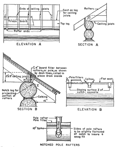 Roofs may be framed in several ways, depending upon the kind of material available and the appearance desired. The framing for a shingle roof, whether of sawed material or round poles, is done in the same way as that of a frame building. The top log on the wall may be cut with a flat seat for the rafters to rest upon, as at Y, in figure 18, A or notched out to receive them as at Z in figure 18, B. The gable ends may be run up with the logs, which is preferable for architectural appearance, or framed like the gables of a frame structure, and then covered with wood siding, shingles, or shakes (fig. 19).