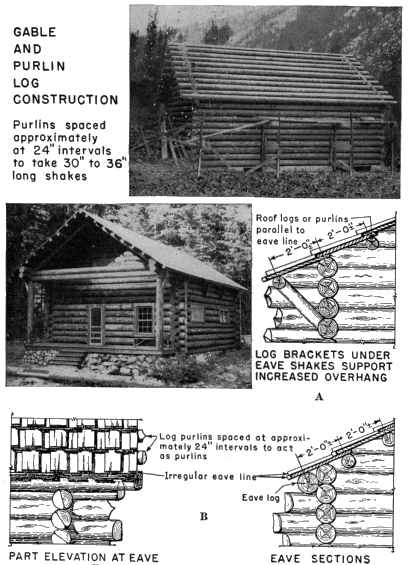 The particular method to be followed in framing the eaves depends largely upon their projection. Where the effect of a considerable overhang is desired, an eave purlin log may be used to support the projecting shakes as shown in figure 19, A. To support 30- to 36-inch long shakes having a 6-inch lap, the log purlins should be spaced at approximately 24-inch intervals, as in figure 19. In regions of heavy snows, the eave log may be placed slightly forward to help support the overhang, or an additional eave log may be placed in position, as shown in figure 19, B. The gable logs should be run up at the same time as the roof logs, and both rigidly framed together.