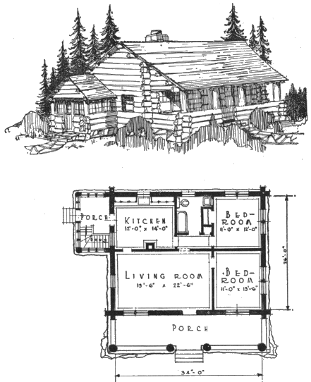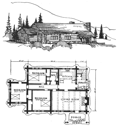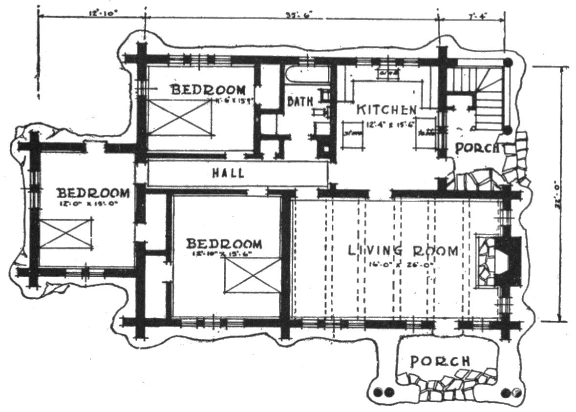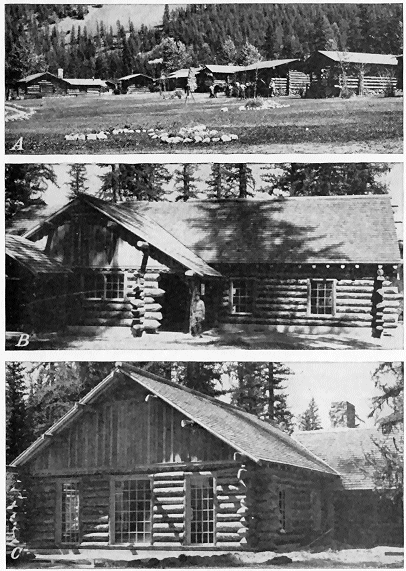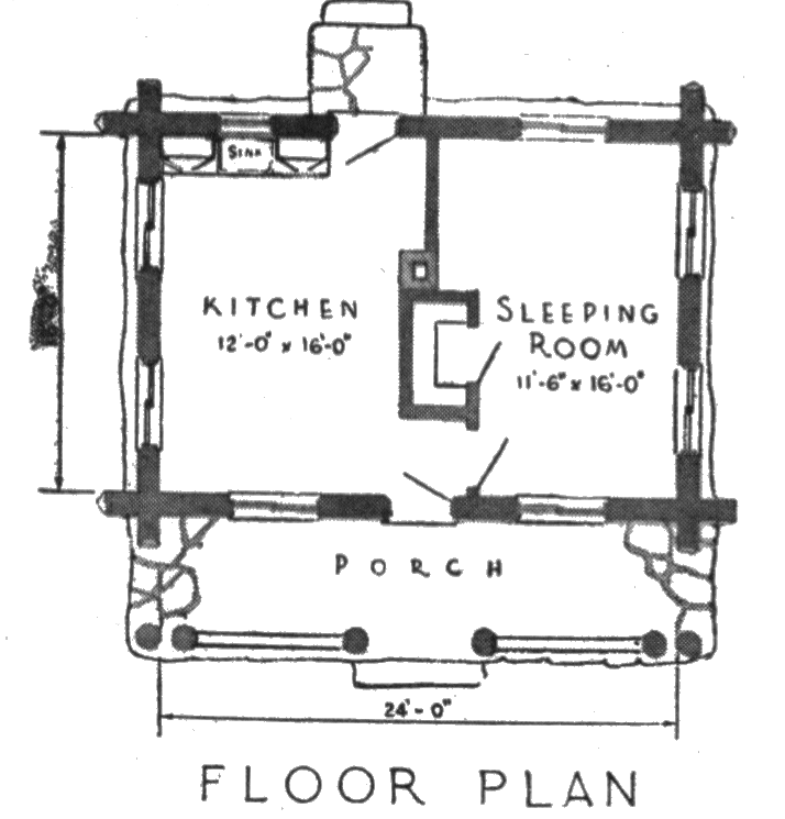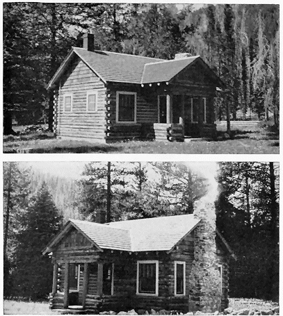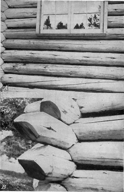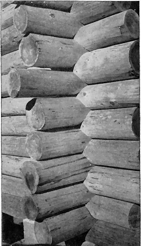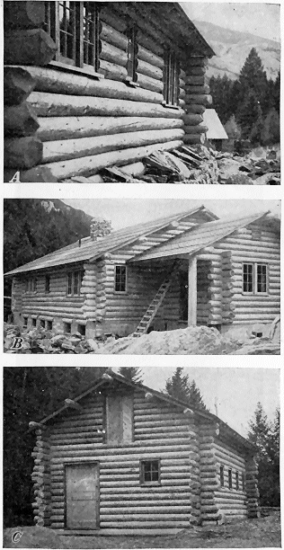 Sometimes it is feasible to take advantage of a portable mill to face the logs on three sides rather than to hew them by hand. The level beds seat the logs so well that calking is minimized, the smooth interior surfaces permit of easy finishing, particularly where wood wainscoting or plaster is used, while the round-log exterior effect is undisturbed, except where the logs project at the corners. Figure 28 illustrates a structure built in this way.