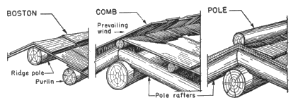 At the ridge of the roof, where the shingles or shakes intersect, provisions must be made for weatherproofing. The shingled Boston ridge, comb intersection, or pole ridge, shown in figure 21 are practical and much more satisfactory from the standpoint of architectural effect than stock metal ridges, ridge boards, and other methods.