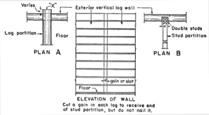 Where frame partitions are used, they should be constructed as in a frame building. A gain or a 3- to 4-inch deep groove should be cut in the log wall into which the end studding of the frame partition is to be set (fig. 22, Plan B). The cut should be made in each log before it is placed in the wall. In no case should the studding at the ends of the partitions be nailed to the log walls which they intersect in order not to interfere with or be affected by their shrinkage and settlement.