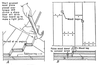 Despite a slight tendency to splinter and wear irregularly over a period of years, plain wide planking of random-width boards makes an appropriate floor for a log building. An attractive effect may be had by using screws instead of nails, countersunk to a depth of ½ inch and concealed by inserting false wooden dowels glued in « 25 » place as shown in figure 23, B. Keying the boards together with wood keys, at random along the edges, adds to the attractiveness of the flooring.