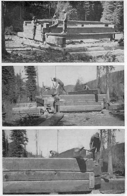 The logs should be fitted together as tightly as possible. In the case of somewhat irregularly surfaced logs, it may be necessary to smooth off certain portions of the under side of the upper log to secure a tight fit. Only in exceptional instances, however, should this be done to the top of the lower log.