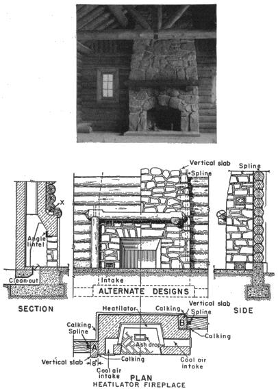 The heatilator is a built-in recirculating steel unit consisting of metal sides and back to form a heating chamber, adjacent to the fire pit, which draws cold air through a register at each side near the floor and after the air is heated ejects it through similar registers above. It should be installed in conformity with the manufacturer’s directions, taking care to select a stock-size unit suitable for the dimensions of the fireplace opening and to erect the surrounding masonry accordingly.