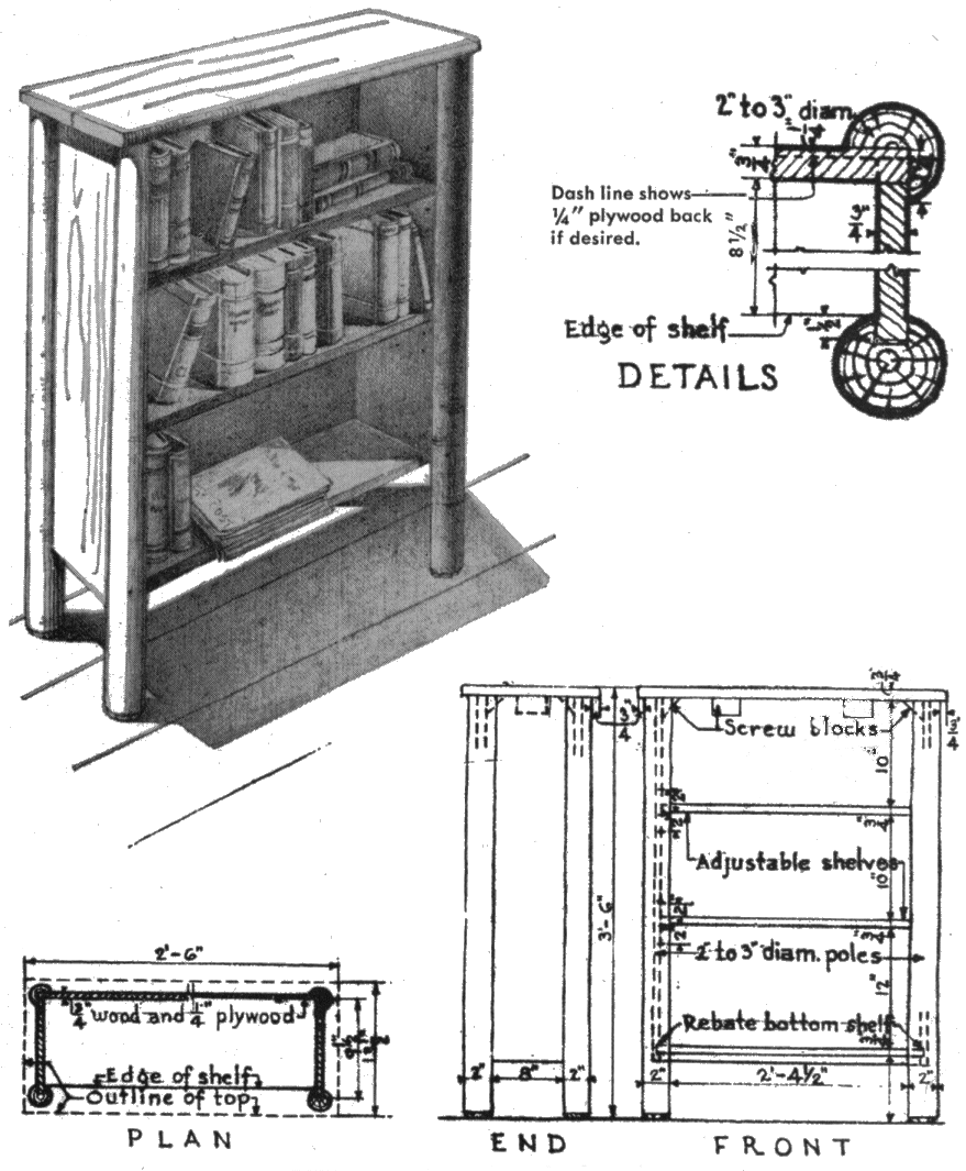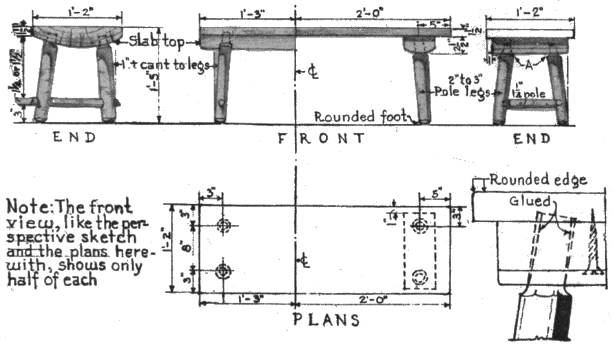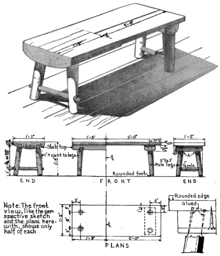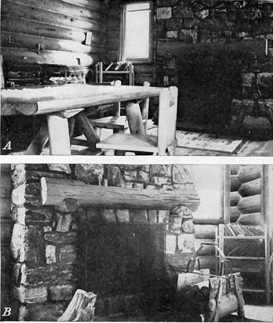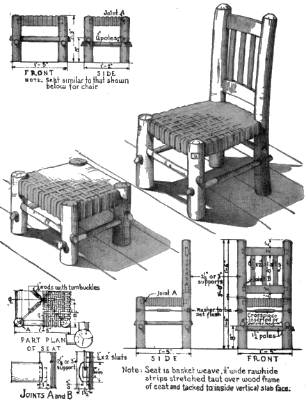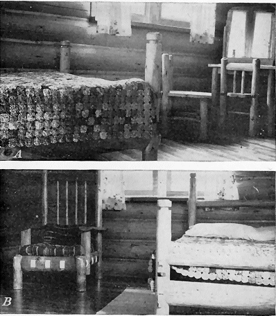 Many cabin owners have found a great deal of pleasure in making essential furniture, such as bunks, beds, tables, chairs, settees, and similar items. In the East, birch is preferred as a material, and in the West, lodgepole pine is most satisfactory. Other native species, however, will do just as well. In making furniture it is advisable to remove the bark from the logs because bark collects insects, causes the wood to deteriorate and eventually falls off, leaving imperfect, unsightly surfaces. Figures 36 and 37 show types of furniture suitable for log residences.