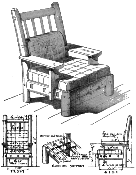 Armchairs can be built with well-seasoned lodgepole or eastern pine, or birch (fig. 38). The cornerpieces should be mortised and tenoned to the frame and rail and anchored in place with ⅜- by 15-inch lag screws. The arms should be fastened to the cornerpieces with ⅜- by 5-inch carriage bolts and to the slab support with ⅜- by 4-inch lag screws. The vertical slab support should be rigidly secured to the frame with ⅜- by 3-inch carriage bolts. Cushions may be of the filler type, without springs, and covered with homespun fabric. Use 2-inch wide heavy canvas strips, securely fastened with furniture tacks, to support the cushions.