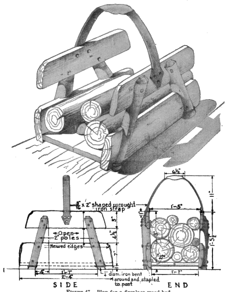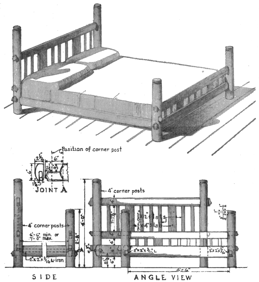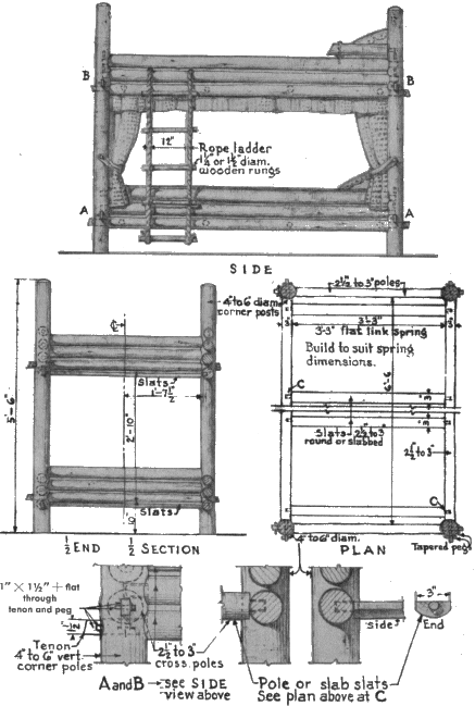 Birch or well-seasoned lodgepole or eastern pine is suitable for making a bed or bunk. In making a bed (fig. 40) the crosspieces should impale the corner posts tightly; the joints should be glued and toe-nailed from below. Do not cut the side or end pieces until the bedspring has been measured and then allow for a slight play in both directions in setting the angle irons, in order to facilitate the insertion and removal of the mattress. Use 14- by 3-inch carriage bolts to fasten the angle irons to the wood frame. Figure 40 is a plan for making a double bed 5 for a single bed, reduce the width accordingly.