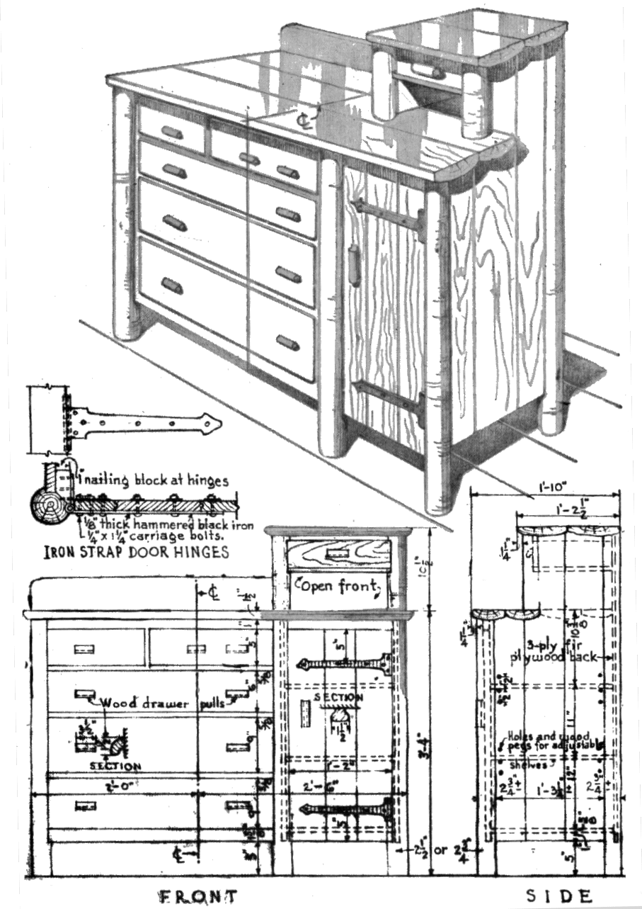No log residence is complete without furniture for storing clothes. A combination chest and buffet suitable for log cabins can be made from well-seasoned lodgepole or eastern pine, tamarack, or birch (fig. 42). The ends, doors, shelves, and drawer fronts should be cut from No. 2 tongue-and-groove commercial pine lumber.