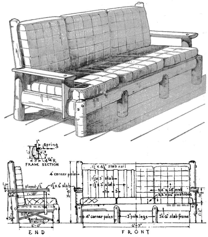 A settee can be made from well-seasoned pine or birch (fig. 43). Join the corner poles to the slab frame and rail with mortise-and-tenon joints; then anchor the joints by means of ⅜- by 6 -inch lag screws. Fasten the arms to the corner poles with ⅜- by 5-inch carriage bolts and to the slab support with ⅜- by 4-inch lag screws. Use ⅜- by 3-inch carriage bolts to fasten the slab support to the frame. The 1- by 2-inch hardwood crosspieces should be securely fastened at the top ends and notched into the legs at the bottom ends, held by 2-inch wood screws, driven into place at an angle. Back slats should be mortised and tenoned to the rail and frame. The cushions should be the filler type, without springs if so desired, and covered with homespun fabric.