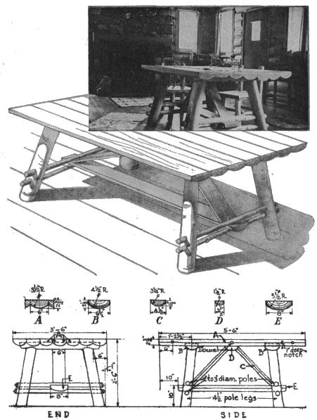 Peeled pine or birch is ideal material for building a dining table (fig. 44). Make a tight saddle joint between B and the legs. Cross poles to impale the legs tightly. Notch E for the cross poles. Upper « 50 » surface of C should be slab-faced and fitted between D and cross poles, all rigidly braced together. Top pieces of tables should be doweled at places indicated in the drawing with ½- by 4-inch wood dowels, glued and clamped to insure tight joints. Notch top pieces A 1-inch deep to receive B and D. Top outside edges of A, C, and E should be hewed.