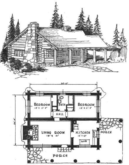 The living-room fireplace, invariably the most prominent interior feature, harmonizes best with a log interior if built of stone and provided with a crude log shelf. The fireplace itself may be either the traditional masonry type or the more modern metal-lined one equipped with a heatilator.