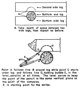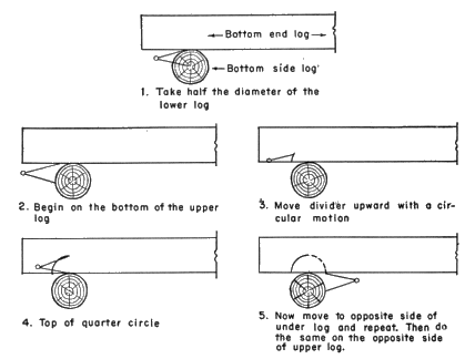 When the next side log is rolled into place, the dividers should be set apart for the width of the space between the top of the first and the bottom of the following log, and the marking repeated as before. If you wish to have the upper log “ride” the lower one a little, so that an especially tight joint is obtained, the dividers should be set a little wider apart than the space actually requires.