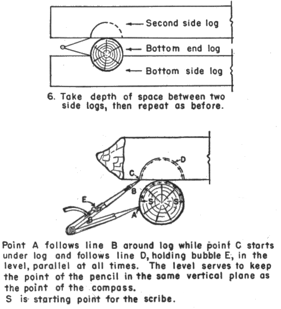 The principle of the scribe is based on parallel lines, and it can readily be seen that if there is a hump on the lower log there will have to be a gouge in the upper one. When the work is done carefully, the space remaining is negligible. Where an airtight wall « 31 » is desired, a strip of plumber’s oakum should be laid on the bottom log before the upper log is dropped into place. If this material is not available, dry moss is a fairly practical substitute.