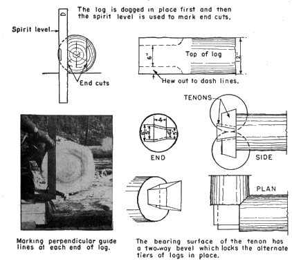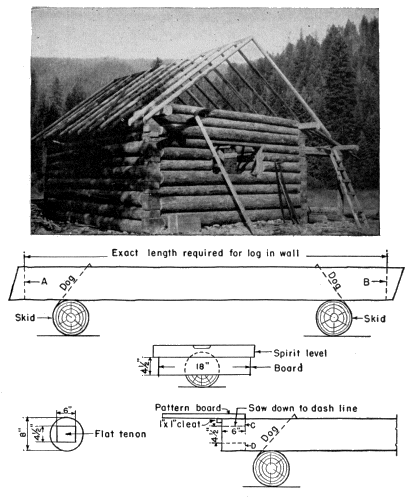 Directions for constructing the flat, or plain, tenon corner.—Square one end of log, as in figure 8, at point A, then measure required length and saw the opposite end square, at B. If the log has any curvature, turn it on the skids until its back is up. Determine the thickness of the tenons, based upon the average top and butt diameters of the log. Then take an 18-inch length of board the same width as the thickness of the tenons, driving a nail through its center and into the center of the log. Place the spirit level on top of the board and mark lines on the log at the top and bottom« 8 » edges. The width of a tenon varies with the diameter of the logs; 8- to 10-inch diameters will produce 6- to 7-inch wide tenons.