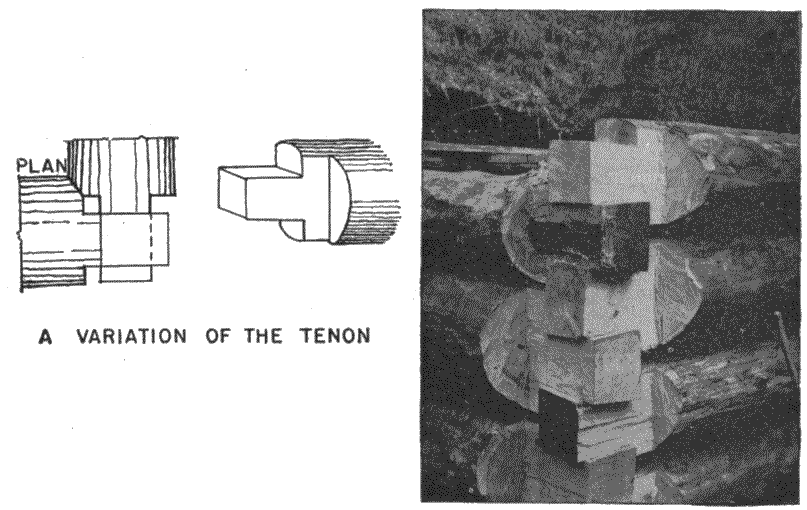 The flat, or plain, tenon corner (fig. 8), is also common. It may be made in two ways. In one, only the bearing surfaces are framed, while in the other, all four sides of the tenon are framed flat. The plain tenon corner does not have the highly desirable feature of being self-locking. However, it is simple to make and economical, and therefore especially suitable for temporary structures. The logs must be pinned together, as shown in figure 11. All the framing can be done on the ground, before the logs are put in place. Carefully fitted, this makes a neat-looking job.