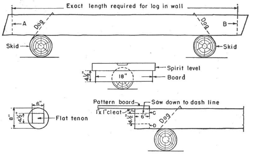 Nail a 1 inch by 1 inch cleat on the pattern board to points C and D and then make saw cuts on each end, cut chip off and smooth the surface. Turn log over and repeat on the other side. After framing out the sides of the tenon, the log is ready to be placed on the wall. Some fitting between corners is usually necessary but, if the logs are fairly straight and smooth, the work will be minimized.