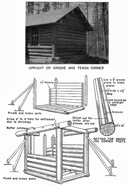 The upright, or groove-and-tenon, corner (fig. 9) is used to a considerable extent in the West. It has desirable features from a mechanical standpoint: (1) The weight of the building is carried on the full length of the logs and does not rest solely on the corners, as in other types, and (2) it makes a tight wall because no openings« 11 » will develop between the logs. Although not difficult to construct, the upright corner requires considerable mechanical skill and accuracy. A good carpenter can frame the entire building on the ground before any logs are placed on the foundation, after which it can be erected in a very short time. Next to the round-notch corner the upright, or groove-and-tenon corner, probably has the best appearance.