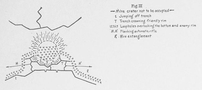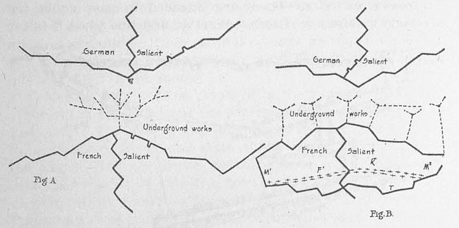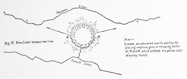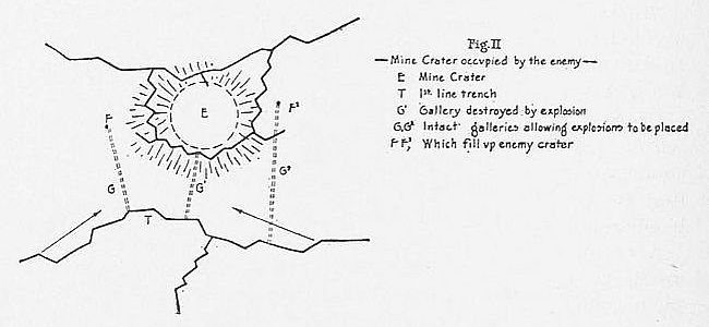 In sectors where the distance between the two lines is below 150 meters, mine warfare must be used. When the trenches are farther apart, underground warfare is seldom employed. In special cases, however, when there are strong ventilators and the line is stable enough to permit of it, advance may be made underground.
