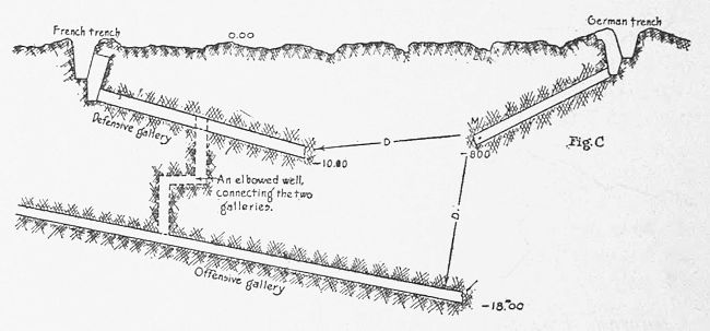 One of the difficult questions in mining is the removal of the earth. Expert miners sometimes remove the earth as far as 100 to 200 meters from the entrance to the gallery. They throw it on old ruined shelters, in shell holes, on the reverse of the trenches. But these precautions are not always rigidly observed. When the noncommissioned officer is absent, or the enemy bombards a little strongly, some one in the working party not wanting to work overtime throws several clods of earth on the parapet.