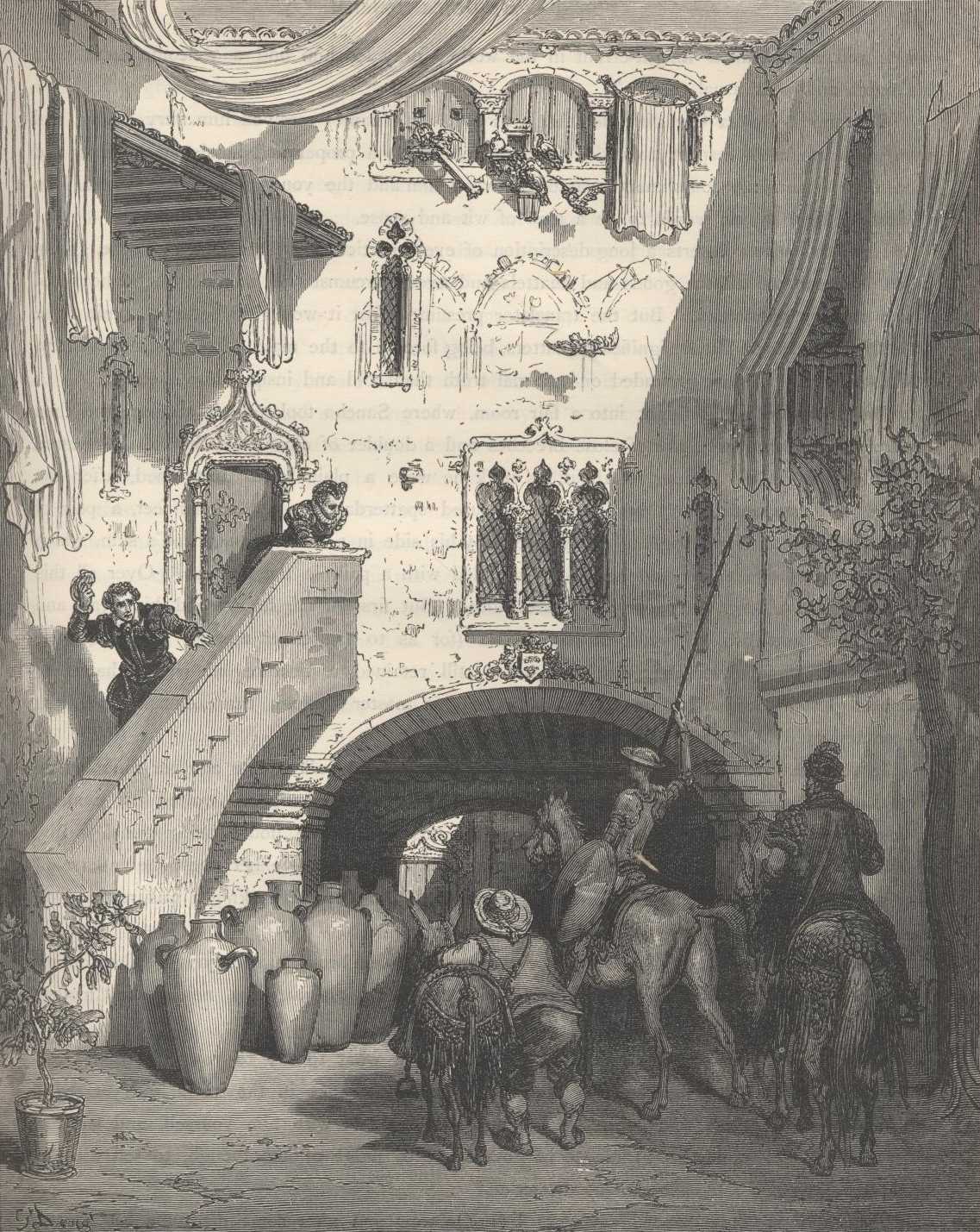 The book cover and spine above and the images which follow were not part of the original Ormsby translation—they are taken from the 1880 edition of J. W. Clark, illustrated by Gustave Dore. Clark in his edition states that, "The English text of 'Don Quixote' adopted in this edition is that of Jarvis, with occasional corrections from Motteaux." See in the introduction below John Ormsby's critique of both the Jarvis and Motteaux translations. It has been elected in the present Project Gutenberg edition to attach the famous engravings of Gustave Dore to the Ormsby translation instead of the Jarvis/Motteaux. The detail of many of the Dore engravings can be fully appreciated only by utilizing the "Enlarge" button to expand them to their original dimensions. Ormsby in his Preface has criticized the fanciful nature of Dore's illustrations; others feel these woodcuts and steel engravings well match Quixote's dreams. D.W.