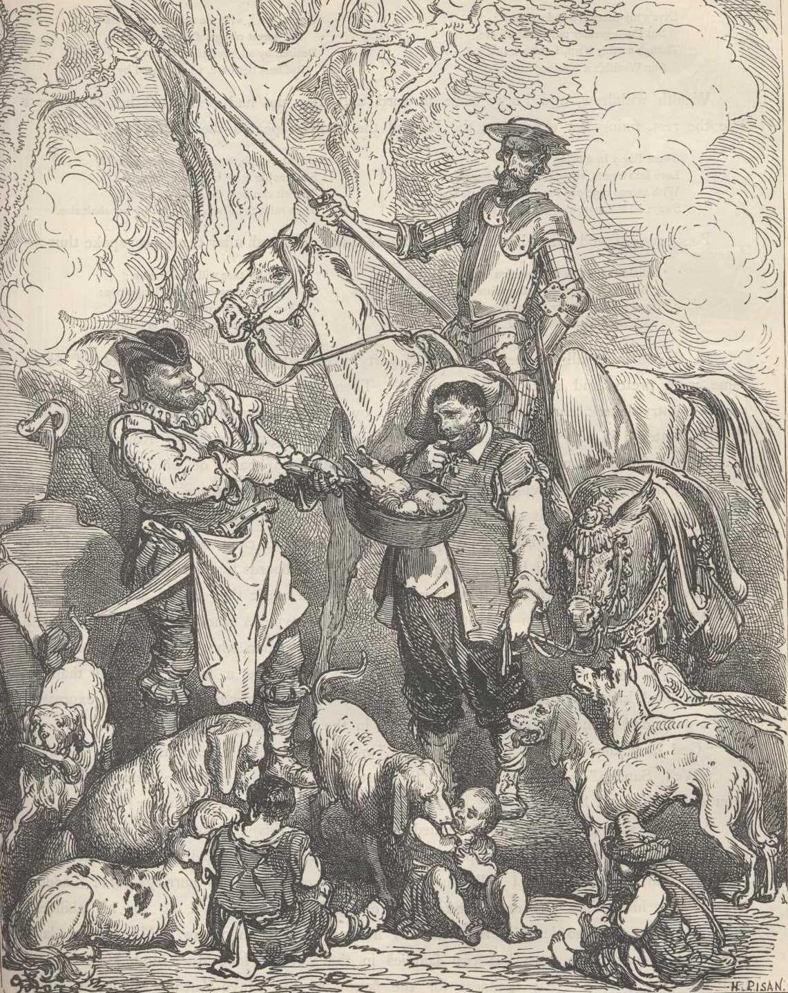 Sancho observed all, contemplated all, and everything won his heart. The first to captivate and take his fancy were the pots, out of which he would have very gladly helped himself to a moderate pipkinful; then the wine skins secured his affections; and lastly, the produce of the frying-pans, if, indeed, such imposing cauldrons may be called frying-pans; and unable to control himself or bear it any longer, he approached one of the busy cooks and civilly but hungrily begged permission to soak a scrap of bread in one of the pots; to which the cook made answer, "Brother, this is not a day on which hunger is to have any sway, thanks to the rich Camacho; get down and look about for a ladle and skim off a hen or two, and much good may they do you."