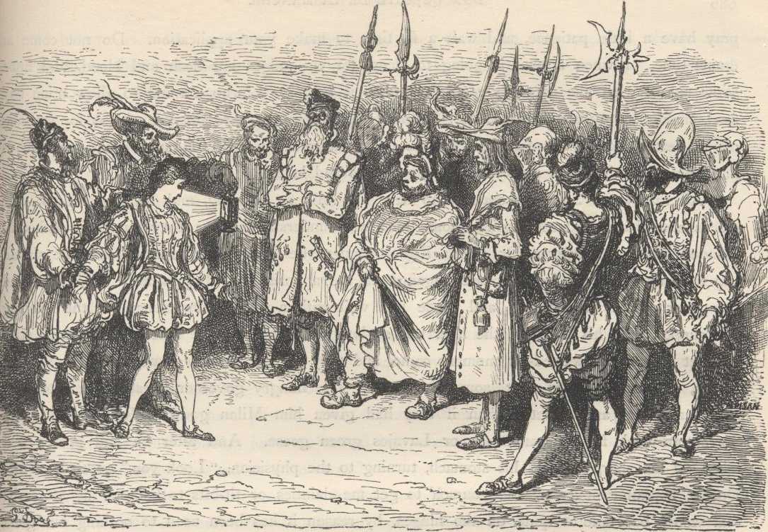 By means of this sophistry Sancho was made to endure hunger, and hunger so keen that in his heart he cursed the government, and even him who had given it to him; however, with his hunger and his conserve he undertook to deliver judgments that day, and the first thing that came before him was a question that was submitted to him by a stranger, in the presence of the majordomo and the other attendants, and it was in these words: "Senor, a large river separated two districts of one and the same lordship—will your worship please to pay attention, for the case is an important and a rather knotty one? Well then, on this river there was a bridge, and at one end of it a gallows, and a sort of tribunal, where four judges commonly sat to administer the law which the lord of river, bridge and the lordship had enacted, and which was to this effect, 'If anyone crosses by this bridge from one side to the other he shall declare on oath where he is going to and with what object; and if he swears truly, he shall be allowed to pass, but if falsely, he shall be put to death for it by hanging on the gallows erected there, without any remission.' Though the law and its severe penalty were known, many persons crossed, but in their declarations it was easy to see at once they were telling the truth, and the judges let them pass free. It happened, however, that one man, when they came to take his declaration, swore and said that by the oath he took he was going to die upon that gallows that stood there, and nothing else. The judges held a consultation over the oath, and they said, 'If we let this man pass free he has sworn falsely, and by the law he ought to die; but if we hang him, as he swore he was going to die on that gallows, and therefore swore the truth, by the same law he ought to go free.' It is asked of your worship, senor governor, what are the judges to do with this man? For they are still in doubt and perplexity; and having heard of your worship's acute and exalted intellect, they have sent me to entreat your worship on their behalf to give your opinion on this very intricate and puzzling case."