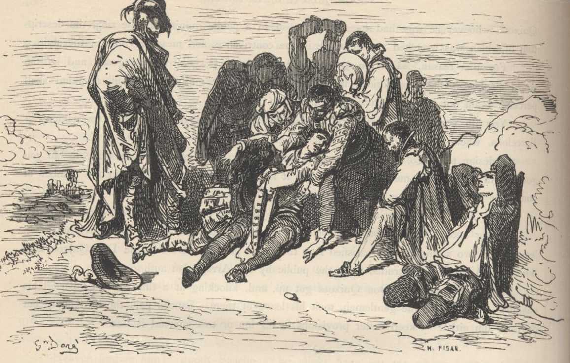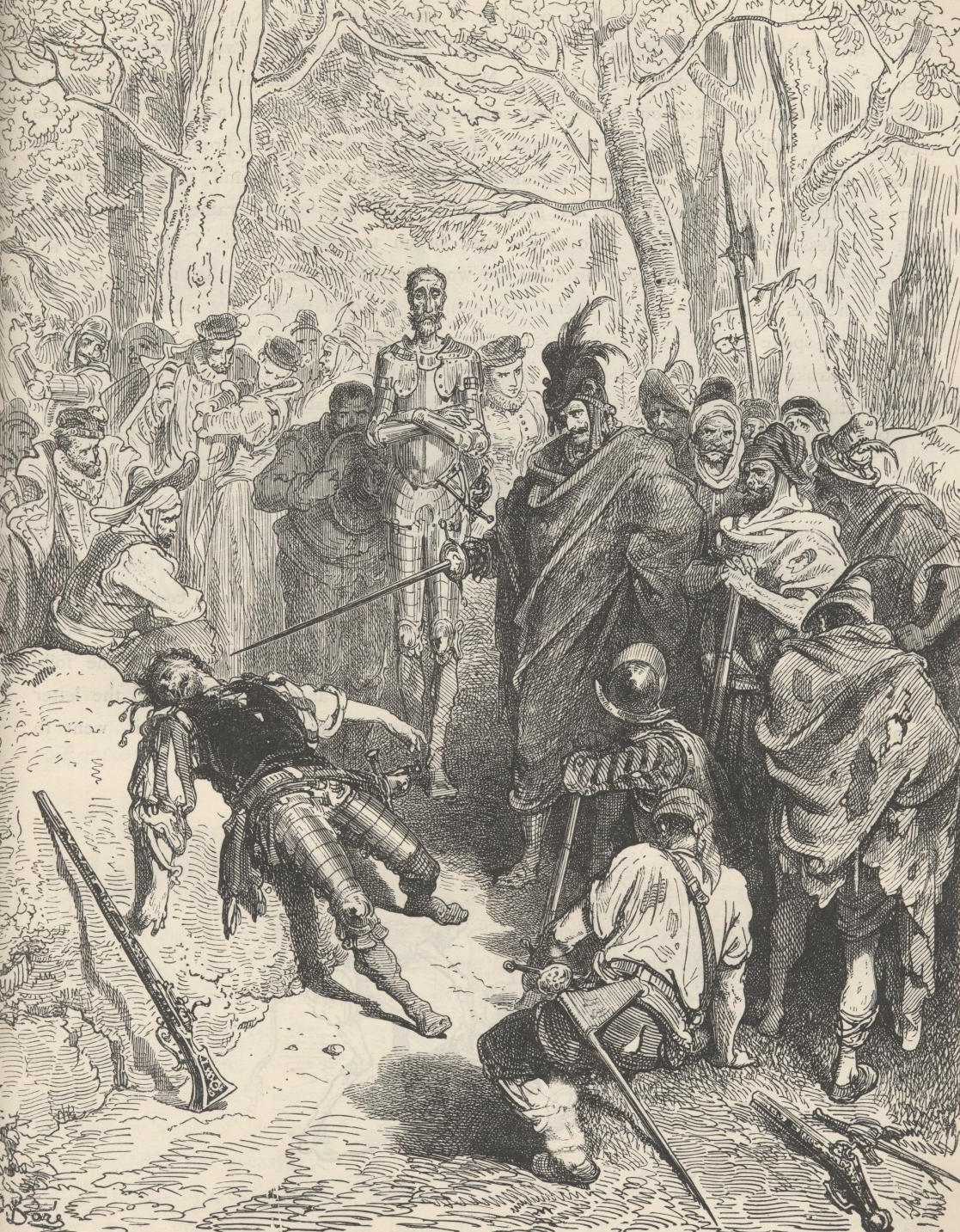 The wounded gentleman opened his all but closed eyes, and recognising Claudia said, "I see clearly, fair and mistaken lady, that it is thou that hast slain me, a punishment not merited or deserved by my feelings towards thee, for never did I mean to, nor could I, wrong thee in thought or deed."