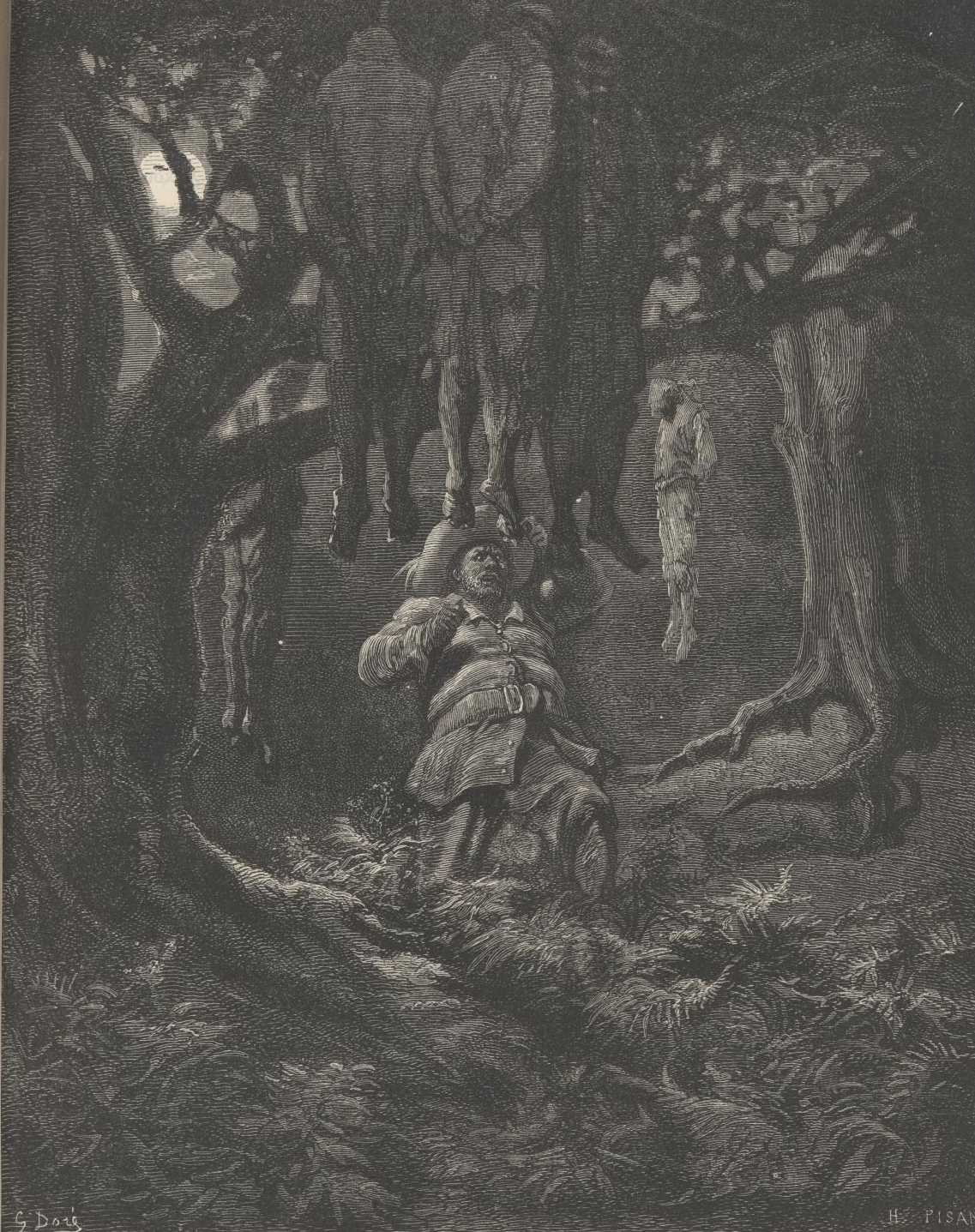 Sancho rose and removed some distance from the spot, but as he was about to place himself leaning against another tree he felt something touch his head, and putting up his hands encountered somebody's two feet with shoes and stockings on them. He trembled with fear and made for another tree, where the very same thing happened to him, and he fell a-shouting, calling upon Don Quixote to come and protect him. Don Quixote did so, and asked him what had happened to him, and what he was afraid of. Sancho replied that all the trees were full of men's feet and legs. Don Quixote felt them, and guessed at once what it was, and said to Sancho, "Thou hast nothing to be afraid of, for these feet and legs that thou feelest but canst not see belong no doubt to some outlaws and freebooters that have been hanged on these trees; for the authorities in these parts are wont to hang them up by twenties and thirties when they catch them; whereby I conjecture that I must be near Barcelona;" and it was, in fact, as he supposed; with the first light they looked up and saw that the fruit hanging on those trees were freebooters' bodies.