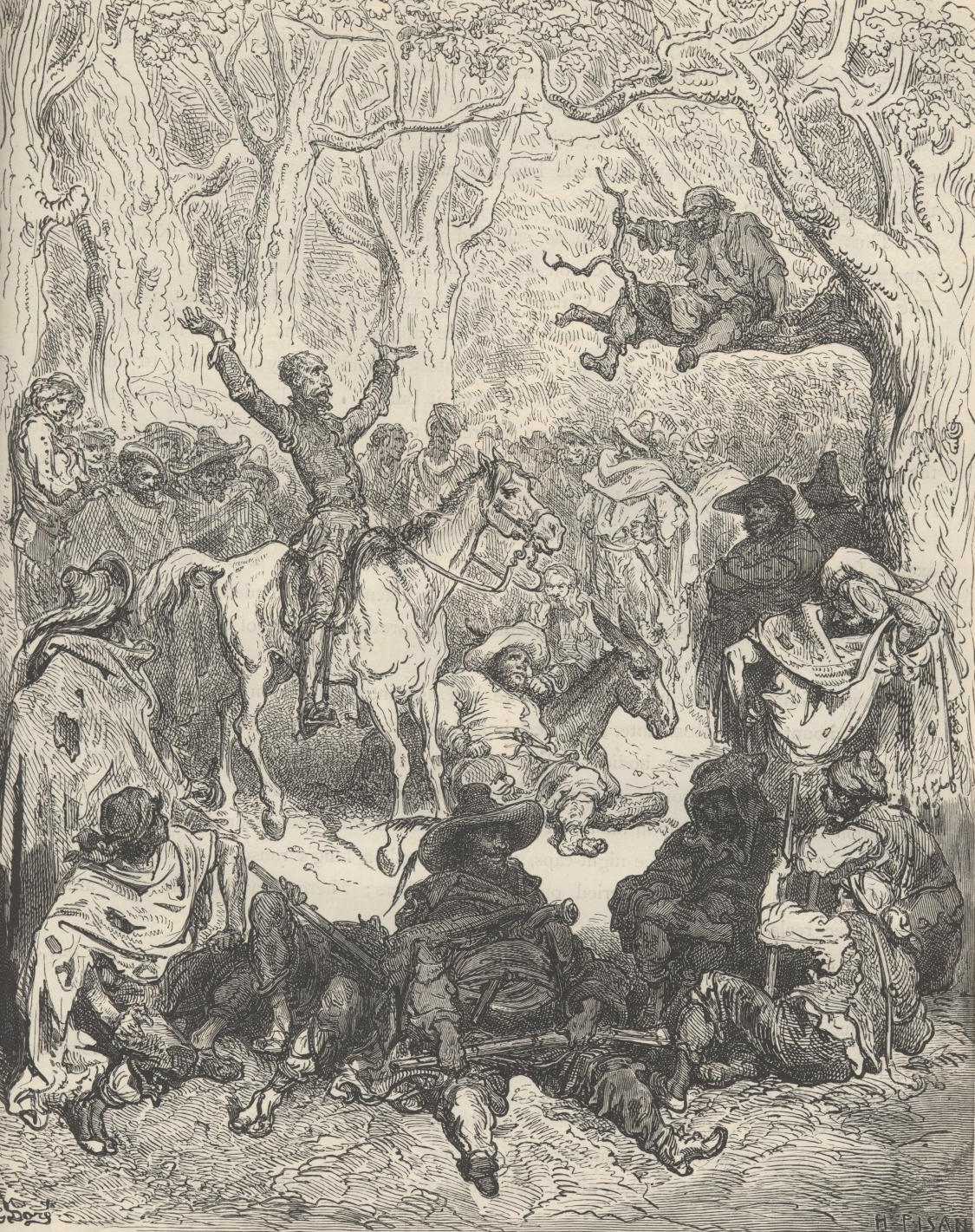 Roque Guinart found his squires at the place to which he had ordered them, and Don Quixote on Rocinante in the midst of them delivering a harangue to them in which he urged them to give up a mode of life so full of peril, as well to the soul as to the body; but as most of them were Gascons, rough lawless fellows, his speech did not make much impression on them. Roque on coming up asked Sancho if his men had returned and restored to him the treasures and jewels they had stripped off Dapple. Sancho said they had, but that three kerchiefs that were worth three cities were missing.