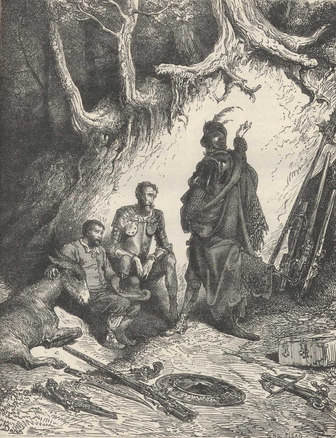 And now day dawned; and if the dead freebooters had scared them, their hearts were no less troubled by upwards of forty living ones, who all of a sudden surrounded them, and in the Catalan tongue bade them stand and wait until their captain came up. Don Quixote was on foot with his horse unbridled and his lance leaning against a tree, and in short completely defenceless; he thought it best therefore to fold his arms and bow his head and reserve himself for a more favourable occasion and opportunity. The robbers made haste to search Dapple, and did not leave him a single thing of all he carried in the alforjas and in the valise; and lucky it was for Sancho that the duke's crowns and those he brought from home were in a girdle that he wore round him; but for all that these good folk would have stripped him, and even looked to see what he had hidden between the skin and flesh, but for the arrival at that moment of their captain, who was about thirty-four years of age apparently, strongly built, above the middle height, of stern aspect and swarthy complexion. He was mounted upon a powerful horse, and had on a coat of mail, with four of the pistols they call petronels in that country at his waist. He saw that his squires (for so they call those who follow that trade) were about to rifle Sancho Panza, but he ordered them to desist and was at once obeyed, so the girdle escaped. He wondered to see the lance leaning against the tree, the shield on the ground, and Don Quixote in armour and dejected, with the saddest and most melancholy face that sadness itself could produce; and going up to him he said, "Be not so cast down, good man, for you have not fallen into the hands of any inhuman Busiris, but into Roque Guinart's, which are more merciful than cruel."