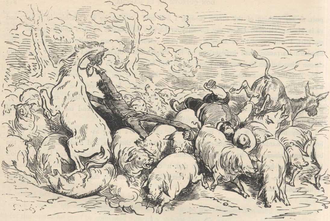 Sancho got up as well as he could and begged his master to give him his sword, saying he wanted to kill half a dozen of those dirty unmannerly pigs, for he had by this time found out that that was what they were.