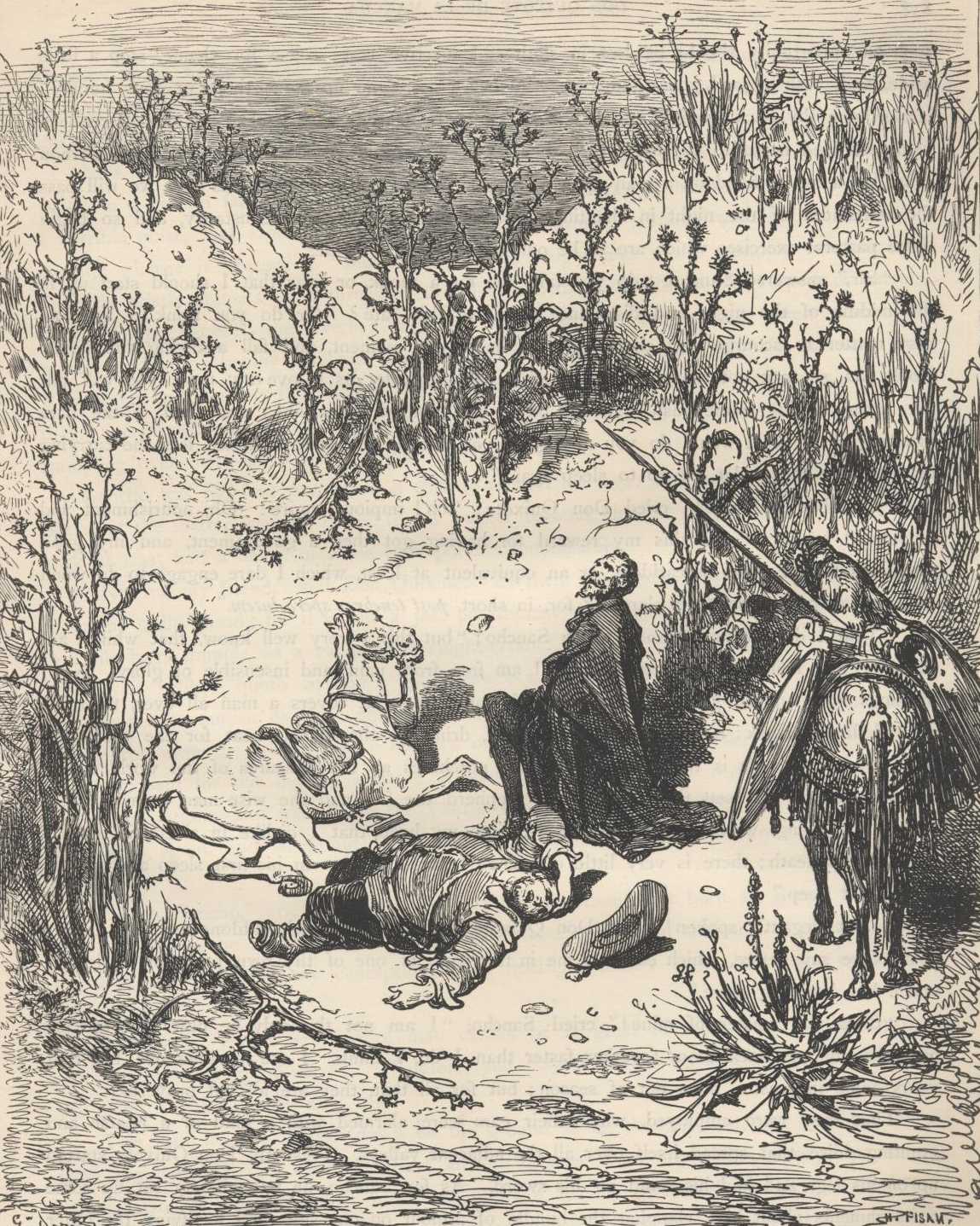 He accompanied each verse with many sighs and not a few tears, just like one whose heart was pierced with grief at his defeat and his separation from Dulcinea.